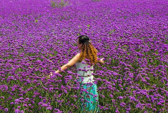 馬鞭花景區(qū),近百畝馬鞭草花田里,鮮花盛開。遠(yuǎn)遠(yuǎn)望去,如同為綠色大地鋪上一層紫色的地毯。微風(fēng)拂動(dòng)下,紫色的馬鞭草愈發(fā)動(dòng)人,吸引了不少游客前來(lái)拍照留影。